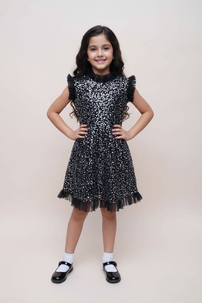 Let your child shine in celebration with our Sequin Party Frock Dress, thoughtfully designed for girls aged 6 months to 8 years. This elegant party frock is artfully embellished with shimmering sequins throughout, while soft ruffle sleeves and a delicate frilled neckline add timeless, playful charm.